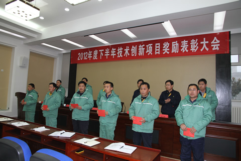 元月30日,公司2012年度下半年技术创新项目奖励表彰大会在多媒体会议室举行。会上,公司奖励技术创新有关人员1.87万元,并号召全员行动起来,向他们学习创新、践行创新,让创新内化为金能人的自觉行动,助力公司的持续健康发展。(图为颁奖现场)。