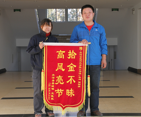 10月17日一大早,家住晏城镇的村民王晓磊将一面绣有“拾金不昧,高风亮节”的锦旗送至金能公司,感谢公司员工贾丽青的拾金不昧。