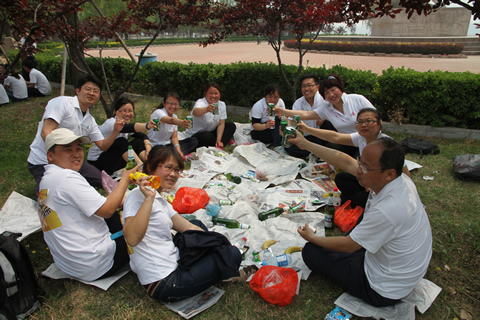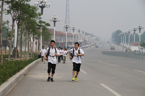 9:40,重新集结后,随着一声哨响,竞赛正式拉开帷幕,参赛队员携带各自用品,一路向南,途中,拉着,推着,鼓励着,共同向前,有的唱起了《一二三四》歌,这是一次意志与耐力的考验,更是一种团队精神的体现。协助公司流程制度绩效优化工作的北大纵横的两位老师闻讯后,欣然加入参赛队伍,并跑完了全程。房莉,已近知天命之年,原本可以不参加此活动,但她主动要求,全程参与,取得了小伙子都自叹不如的好成绩。焦玉磊,体重100公斤,比赛途中,腿部出现了抽筋,但他硬是坚持跑至终点。11:48,在大家的欢呼声中,28支队伍240余人成功抵达红心广场,无一个人掉队,胜利完成了15.2公里的新长征。