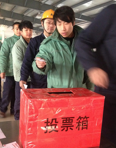 对测评较差人员,公司予以免职,空缺岗位重新竞聘上岗(图为下级测评投票中)