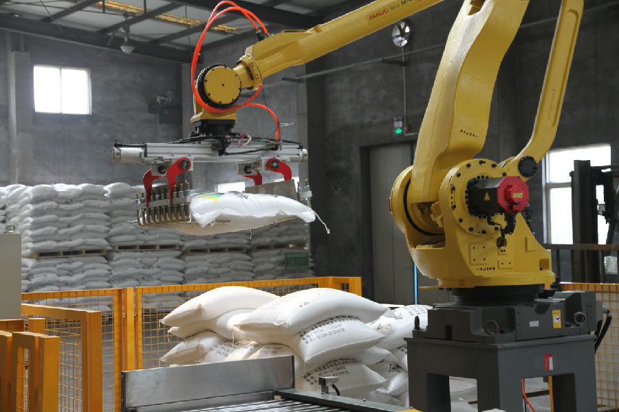 日前,公司投资60余万元从日本进口了机械手,配套新上了整平机、皮带及电子秤纠错系统,用以硫酸铵的搬运打垛,现运行良好。投用后,大大降低了员工劳动强度,可减少操作人员6个(图为机械手工作场景)。