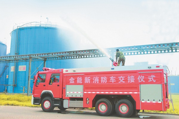 为全县的消防安全提供了设备保障,助力平安齐河的建设。(图为消防官兵使用消防车进行消防演习)。
