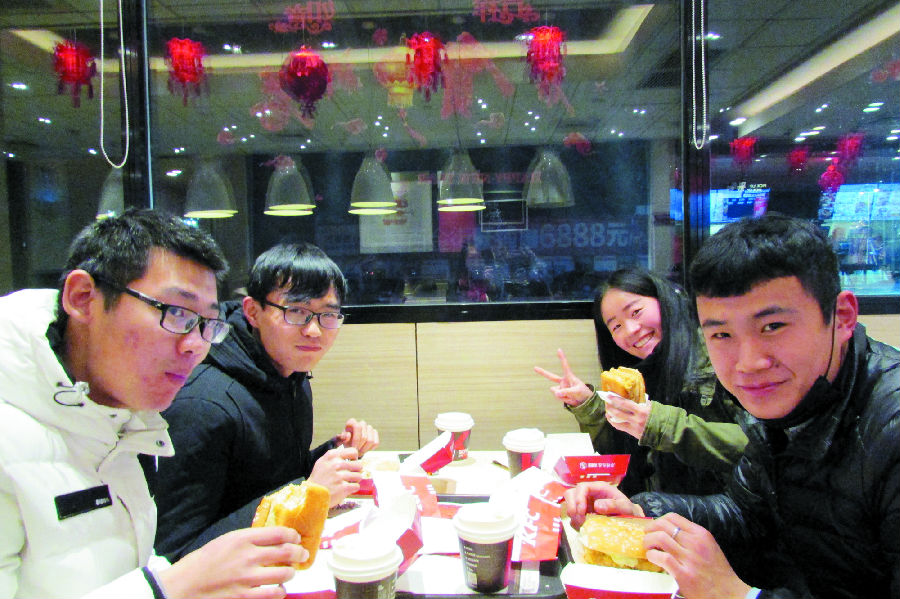 “围炉聚炊欢呼处,百味消融小釜中”,三五好友,围桌而坐,热气腾腾的火锅,丰盛的食材,肉类、海鲜类、蔬菜类、豆制品类、菌菇类等一应俱全,把盏共饮,吃得不亦乐乎。肯德基餐厅内,香喷喷的汉堡、色香味俱全的鸡腿、鸡翅、清凉的饮料、酥焦的薯条,年青朋友边吃边聊,吃得开心,玩得痛快,欢声笑语不时响起,度过了一个有意义的节日。