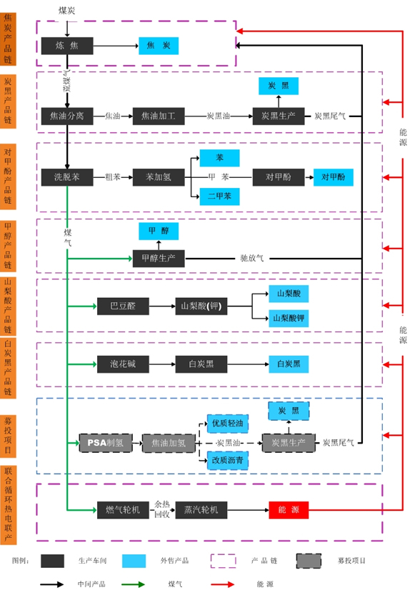 公司集炼焦和化产、煤焦油深加工和炭黑生产、苯加氢和对甲基苯酚生产、泡花碱和白炭黑生产、山梨酸及山梨酸钾生产、焦炉煤气制甲醇、燃气轮机联合循环热电联产等业务于一体,主要产品包括焦炭、炭黑、白炭黑、山梨酸及山梨酸钾、对甲基苯酚等,下游涉及钢铁、轮胎、塑料、化纤、医药、食品等行业。